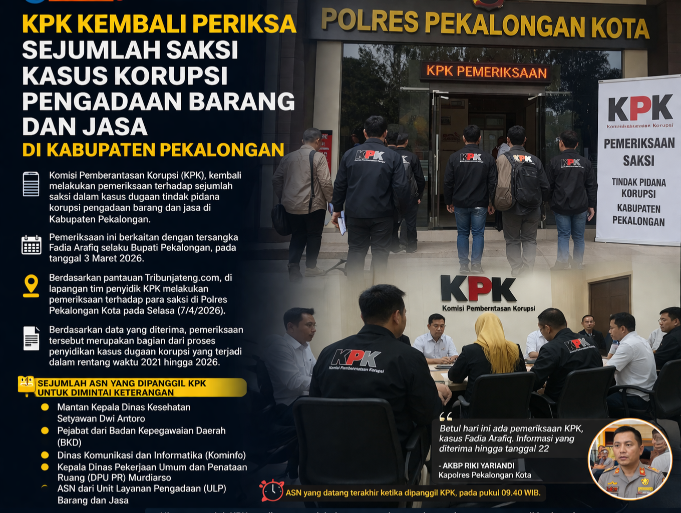 SAHABATNKRI.COM, PEKALONGAN – Komisi Pemberantasan Korupsi (KPK), kembali melakukan pemeriksaan terhadap sejumlah saksi dalam kasus dugaan tindak pidana korupsi pengadaan barang dan jasa di Kabupaten Pekalongan.