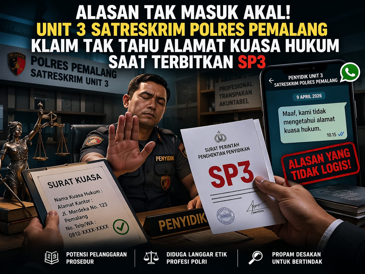 Peristiwa ini menjadi ujian serius bagi aparat penegak hukum, khususnya di lingkungan Satreskrim Polres Pemalang. Di tengah tuntutan keterbukaan informasi, alasan yang tidak berdasar justru berpotensi memperkuat persepsi negatif masyarakat.